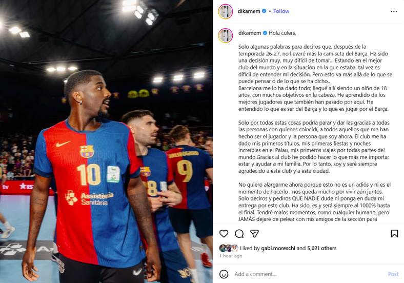 Choosing between staying in Barça, a club that he led to three trophies in the EHF Champions League in the last four years (2021, 2022 and 2024) and moving to another project was a tough choice for Mem. “I am super fine in Barcelona, I have an incredible situation,” he admitted. In a post published on his social media on Saturday morning, Dika Mem went a little bit further, describing his current club. “It might be hard to understand the decision I made, especially in the situation that I am in, in the best club in the world. Barça gave me everything, since I arrived there as an 18-year-old kid,” he wrote. “I am, and I will forever be grateful towards this club and this city.”