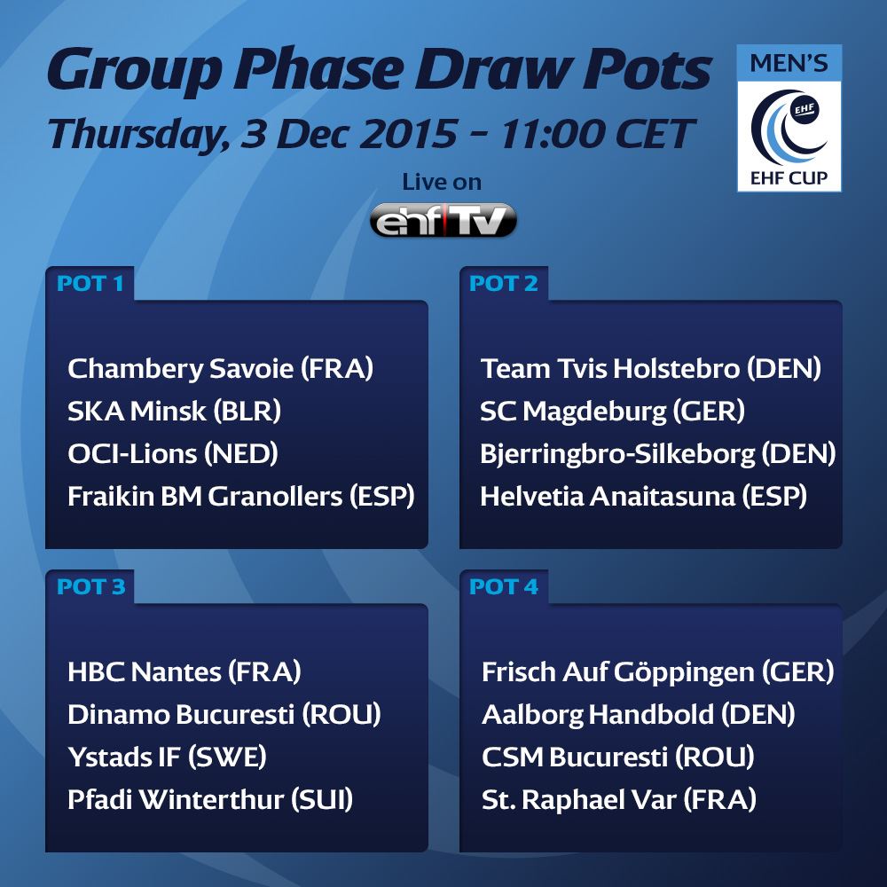Helvetia Anaitasuna from Pot 2 will be drawn before the remaining teams of Pot 2 and avoid the group with Fraikin BM Granollers, while the same procedure will be applied for HBC Nantes in Pot 3, who have to avoid the group with Chambery Savoie Handball.