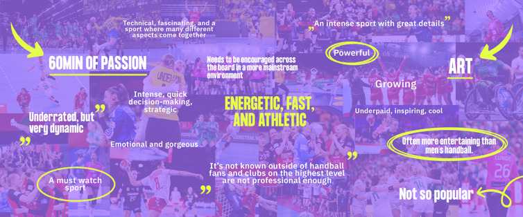 Most notably, female handball players in the 35 national teams competing at the top level see their game as fast, quick and dynamic; different than men’s handball; fun, entertaining and exciting; and physical, hard and aggressive. The only other negative perception that was somewhat prominent was that some people apply gender stereotypes to the game — the idea that it is “not for women.”