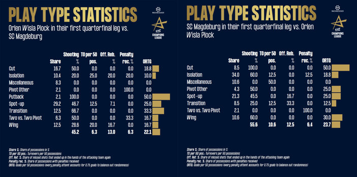 Plock, in turn, has relied more on the play types run-in, spot-up, transition and two versus two plays where the pivot receives the ball in the end. But their efficiency is erratic. For example, in the two group stage matches against Magdeburg they were very efficient in wing shots, scoring more than 33.3 and 31.3 goals per 50 possessions. But in the first leg of the quarter final, it was just 16.7. Therefore, it’s impossible to deduce anything from this for this week’s Match of the Week.