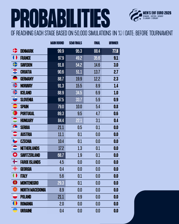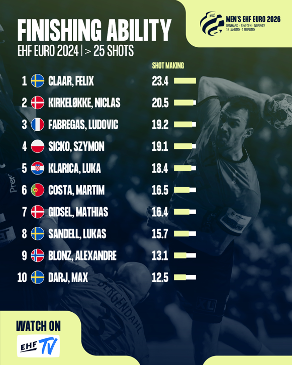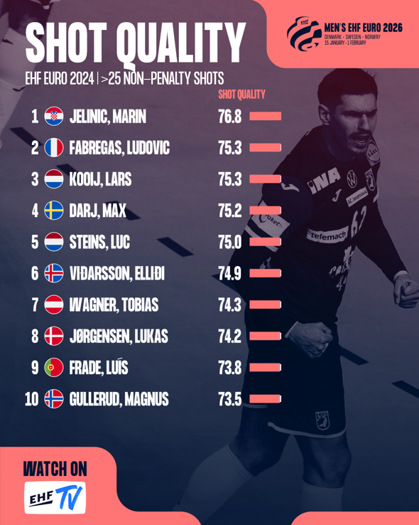 The model used here and for analysis during the whole EHF EURO 2026 includes more than 100,000 shots with data that includes the distance and angle of the shot, the position of the goalkeeper, the hand of the shooter, the type of shot and the pressure on the shooter.